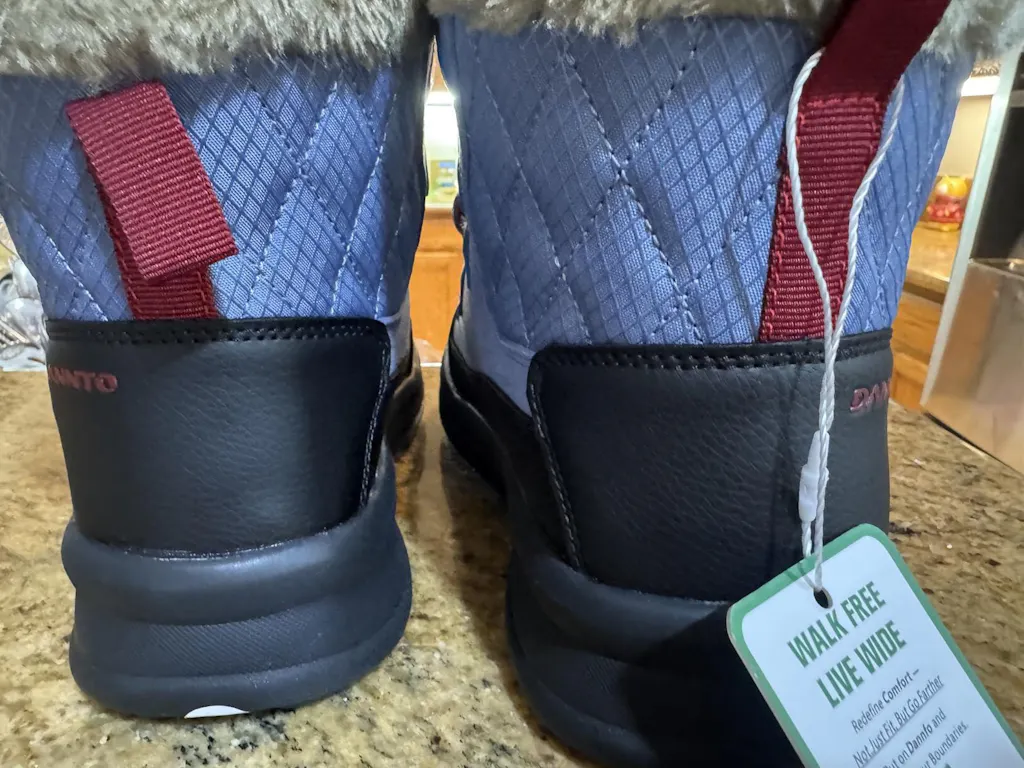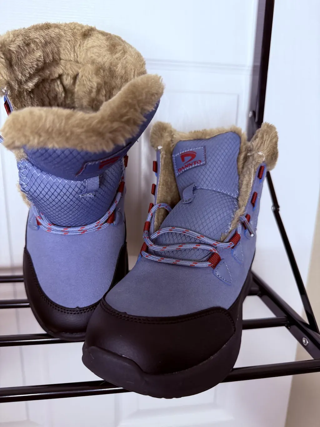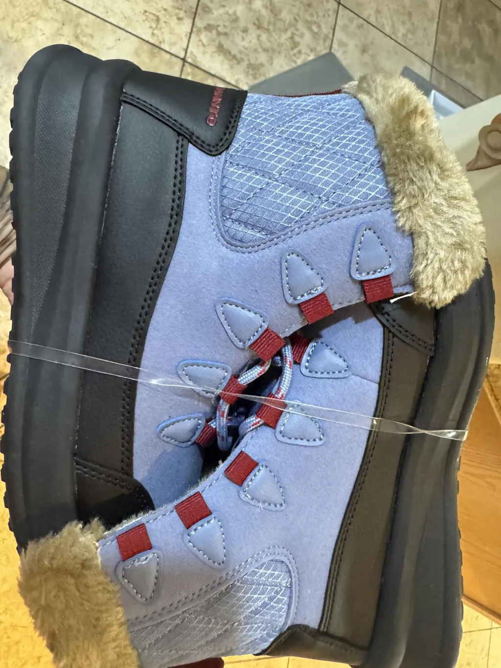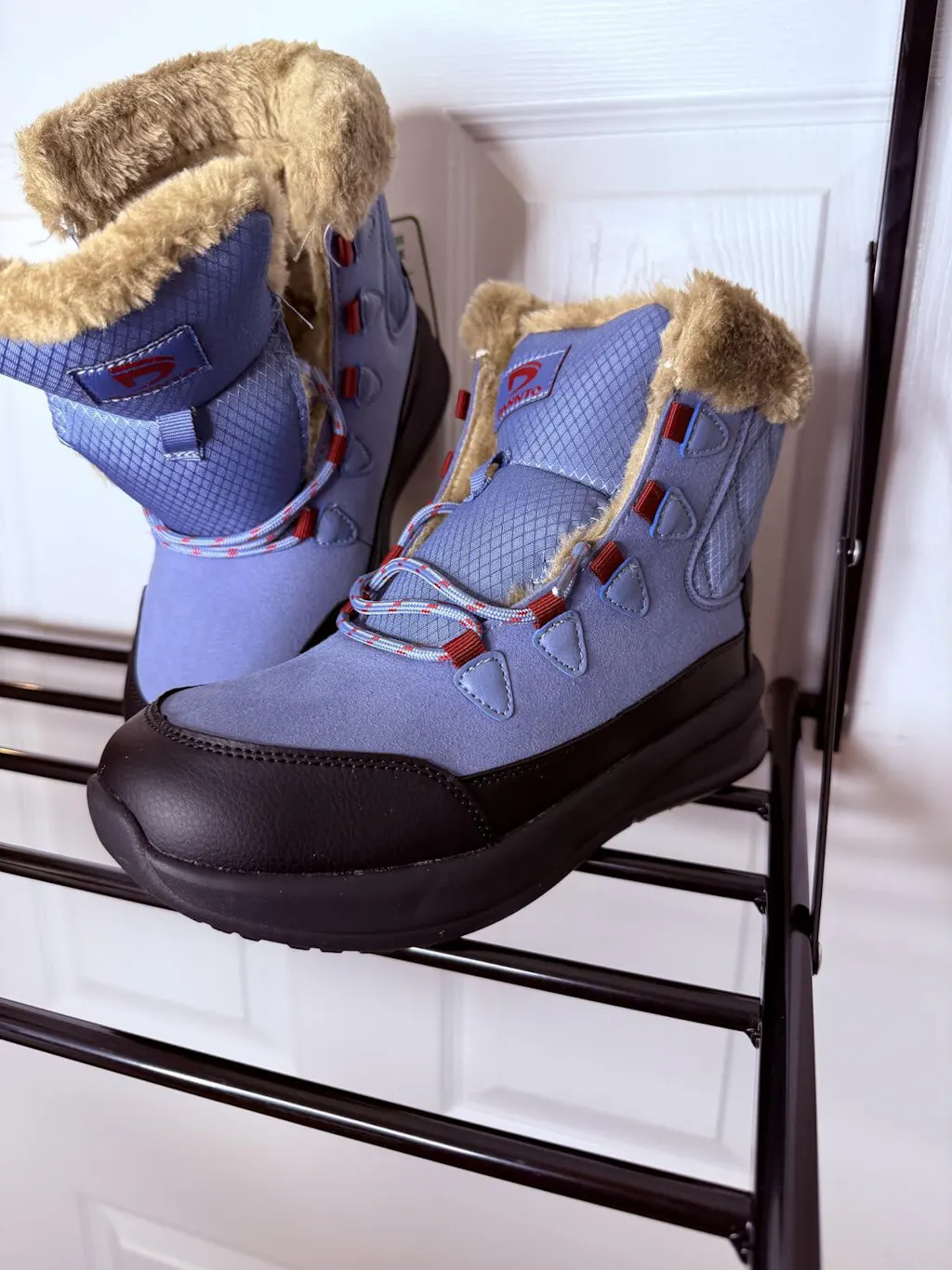 The boots are made of a very nice quality Suede, Polyester, Faux Fur and Synthetic Leather. The quality of all 4 materials is excellent and they work nicely in combination. The beautiful blue faux suede stands out nicely against the red, black and brown accents. The Faux Fur definitely makes a statement and works nicely against the blue and retains heat nicely.