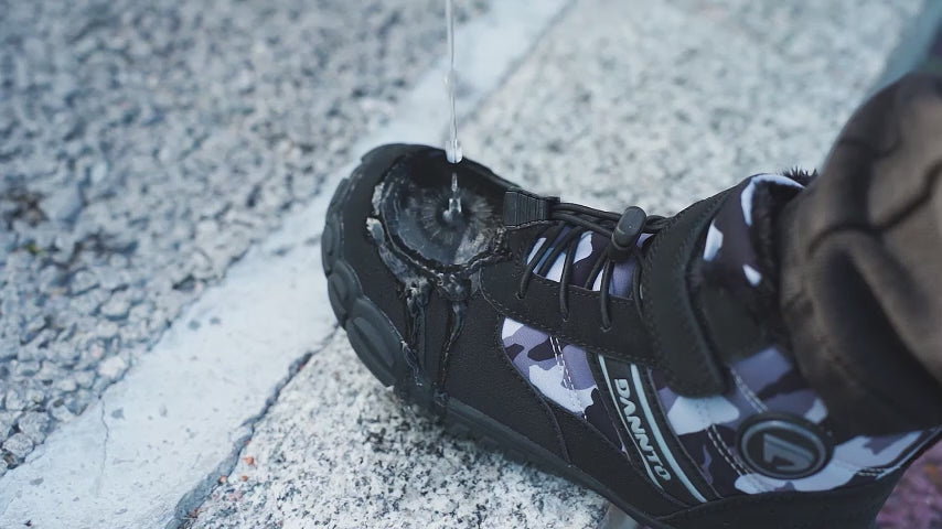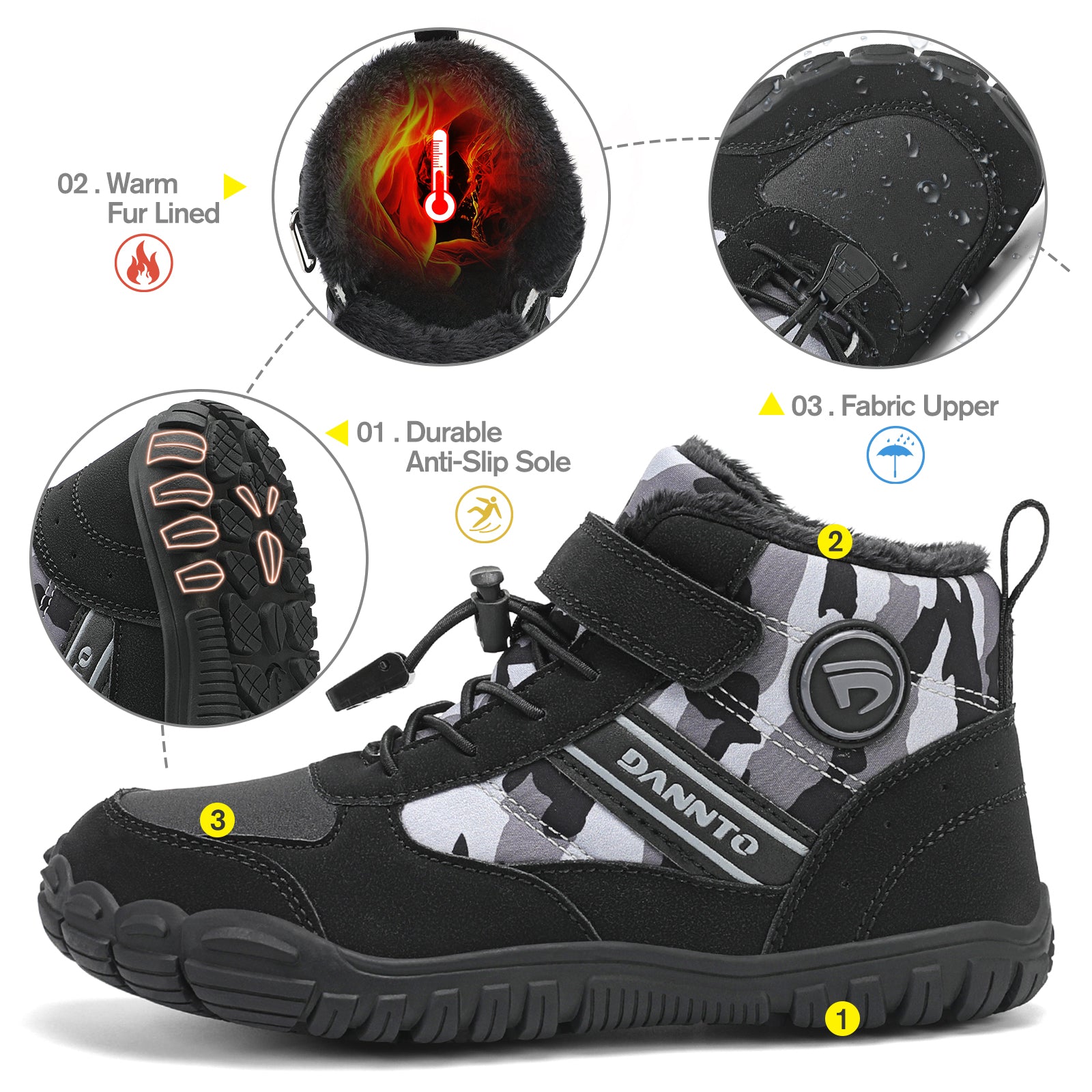 20 SEGUNDOS DE VISIÓN:Las botas de invierno de corte ancho para niños DANNTO combinan una espaciosa puntera estilo descalzo, un cálido forro de piel sintética, un ajuste seguro con elástico y velcro, una suela acolchada duradera y una resistente suela de goma antideslizante para mantener los pies de los pequeños seguros y cómodos en la nieve, el hielo y el terreno invernal resbaladizo.