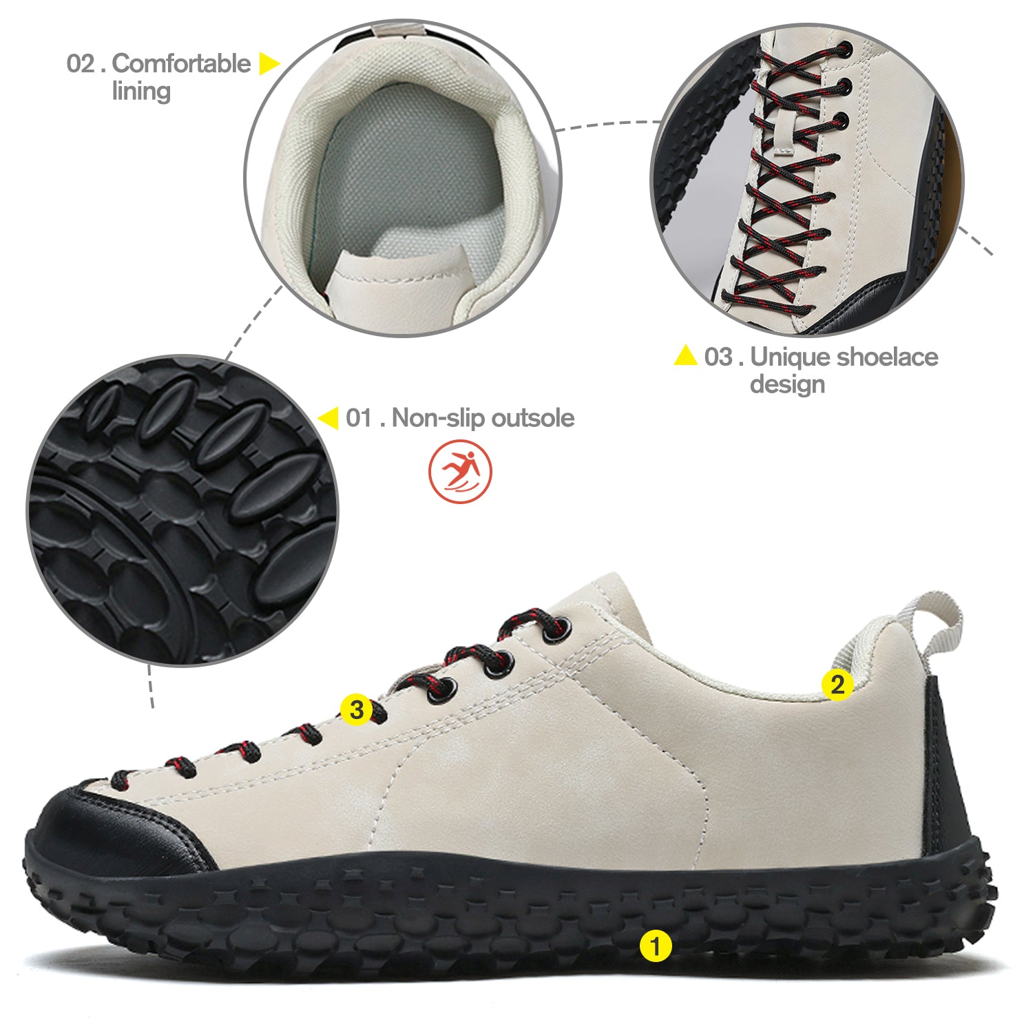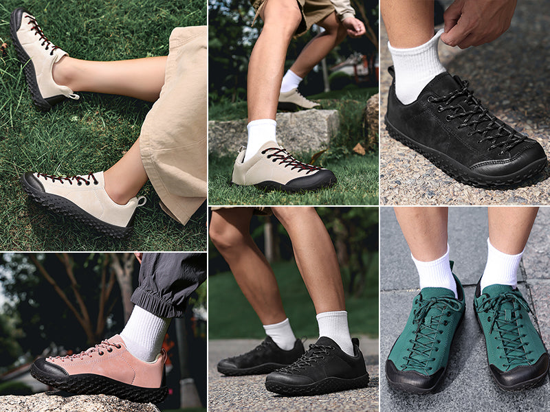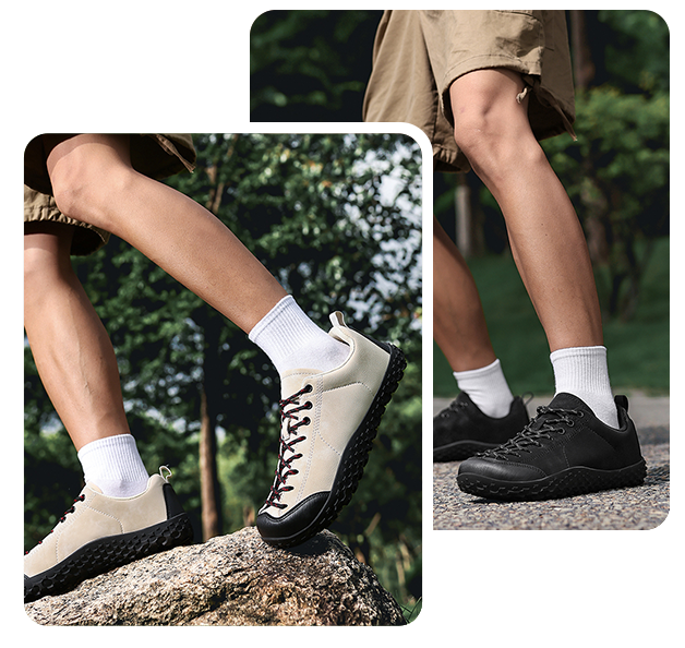 Diseñados para la libertad de movimiento y las aventuras diarias, estos zapatos minimalistas de horma ancha ofrecen comodidad natural, agarre estable y versatilidad. El antepié ensanchado mejora el equilibrio, mientras que la suela de goma antideslizante se adapta a senderos, aceras y caminos cotidianos: perfectos para caminar, hacer senderismo, la vida urbana o para uso casual.